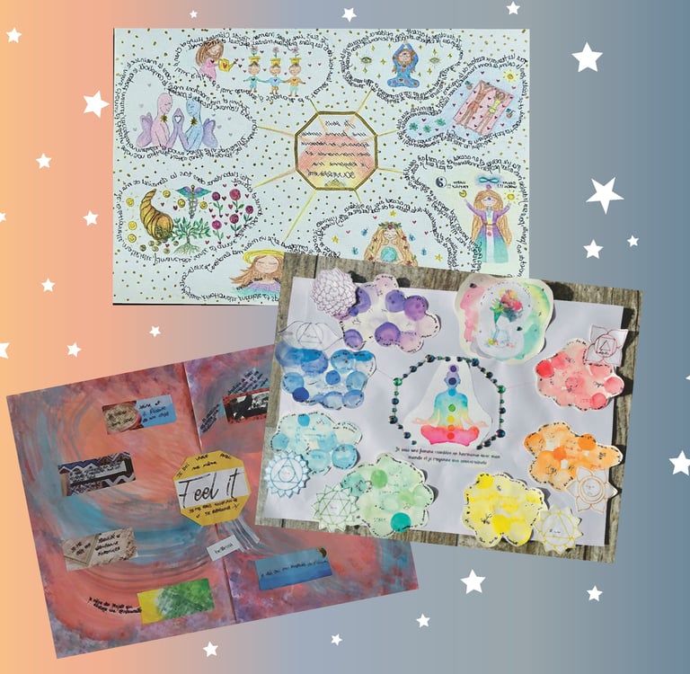 A travers 2 séances rythmées de cartomancie et de créativité, vous réaliserez un collage créatif d'images, de dessins personnels, de citations, de mots...Vous permettrez à votre inconscient de travailler dans l'invisible pour manifester vos objectifs et vos rêves dans le visible, dans la matière, dans votre monde.