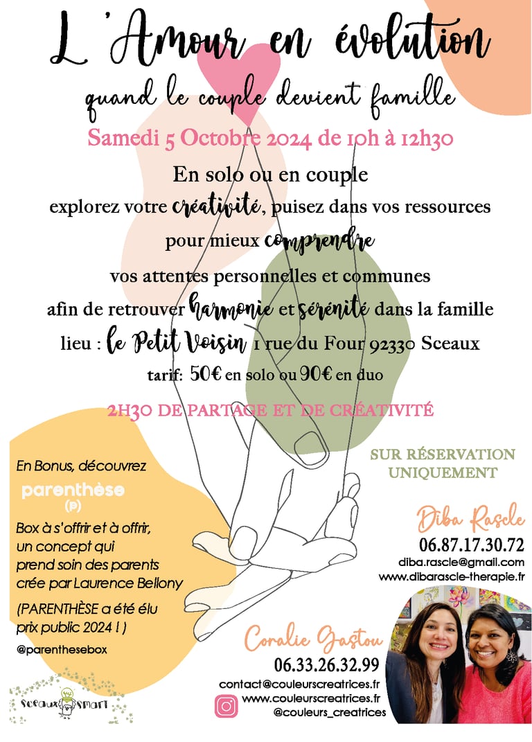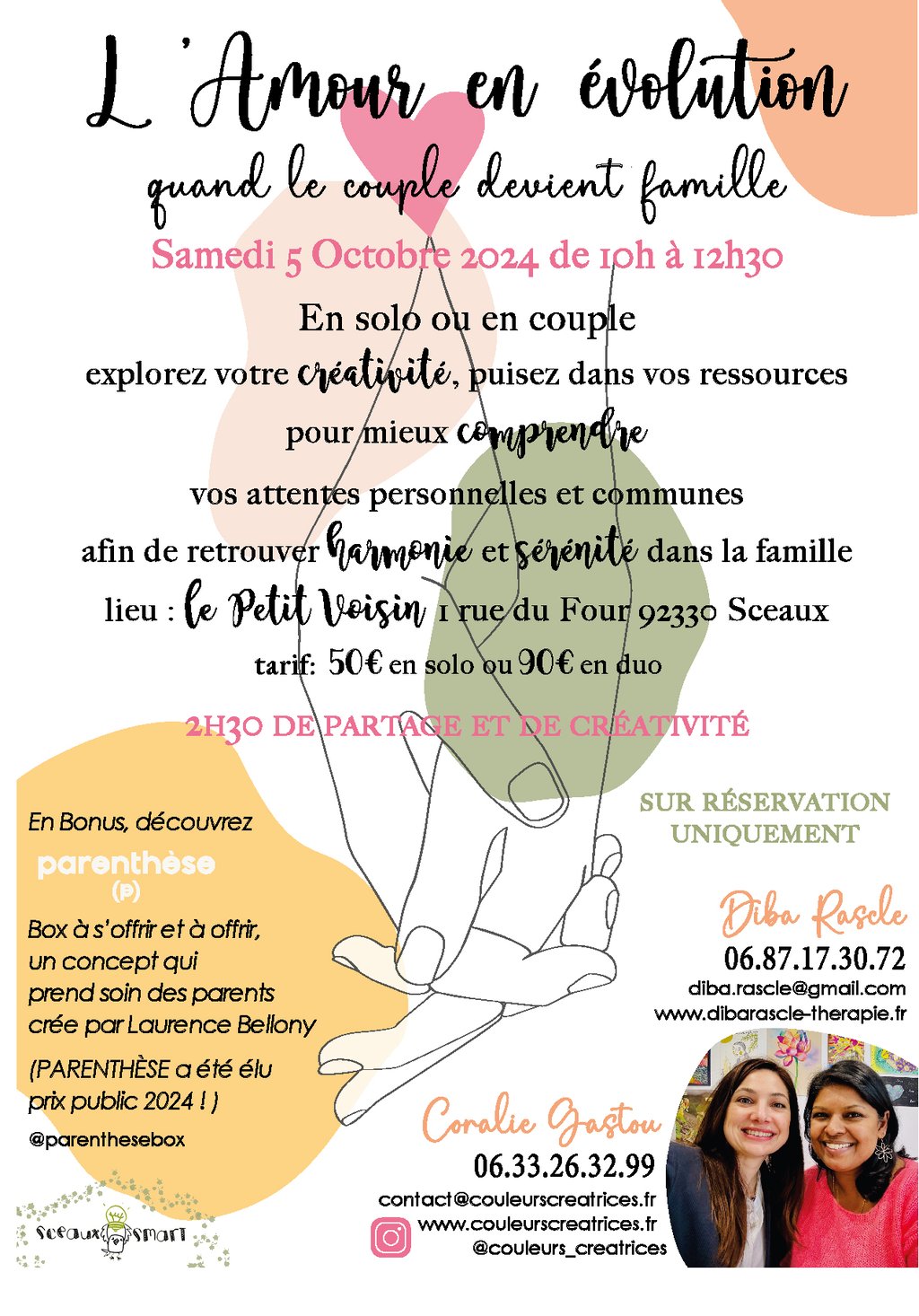 En solo ou en couple, explorez votre créativité, puisez dans vos ressources pour mieux comprendre vos attentes personnelles et communes afin de retrouvez harmonie et sérénité dans votre famille.